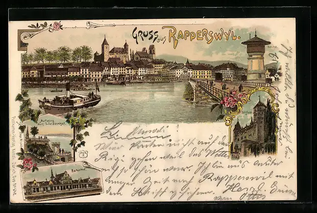 Lithographie Rapperswyl, Bahnhof, Schloss, Ortsansicht mit Dampfer