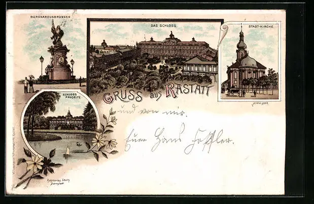 Lithographie Rastatt, Schloss, Stadtkirche, Bernhardusbrunnen