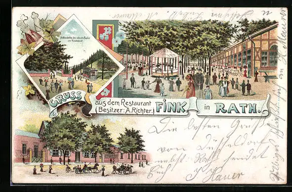 Lithographie Rath / Düsseldorf, Restaurant Fink von A. Richter, Haltestelle der electr. Bahn