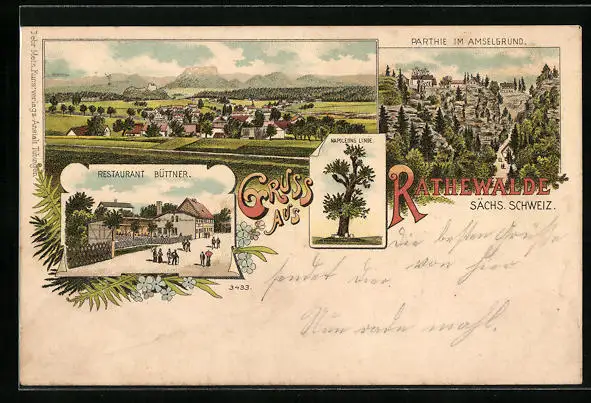 Lithographie Rathewalde /Sächs. Schweiz, Restaurant Büttner, Napoleons Linde, Partie im Amselgrund