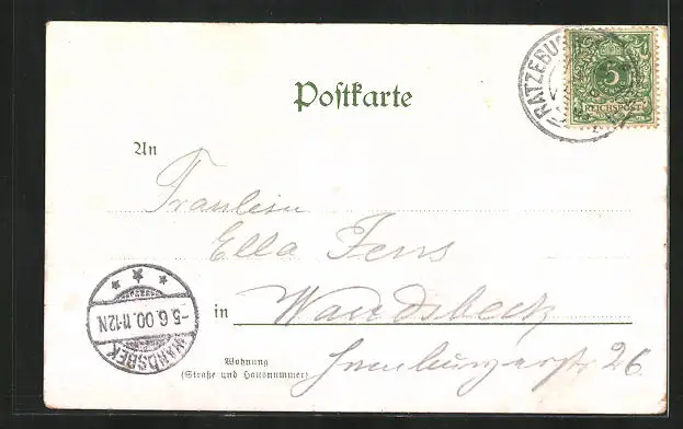 Personenbezogene Daten auf der Rückseite der Karte wurden durch blauen Textmarker unkenntlich gemacht. Die blauen Stellen sind auf die Vorderseite durchgeweicht und wirken sich negativ auf das Postkartenfoto aus