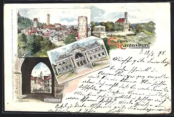 Lithographie Ravensburg, Veitsburg, Oberthor, Panorama