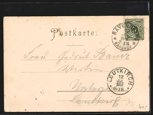 Personenbezogene Daten auf der Rückseite der Karte wurden durch blauen Textmarker unkenntlich gemacht. Die blauen Stellen sind auf die Vorderseite durchgeweicht und wirken sich negativ auf das Postkartenfoto aus