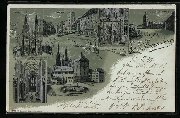 Lithographie Regensburg, Moltkplatz, Römerturm, Dom