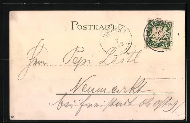 Personenbezogene Daten auf der Rückseite der Karte wurden durch blauen Textmarker unkenntlich gemacht. Die blauen Stellen sind auf die Vorderseite durchgeweicht und wirken sich negativ auf das Postkartenfoto aus