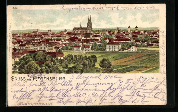 Lithographie Regensburg, Panorama mit Blick zur Kirche