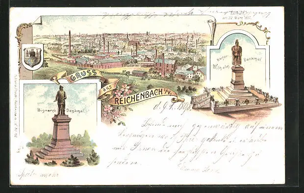Lithographie Reichenbach i. V., Totalansicht, Kaiser Wilhelm Denkmal, Bismarck Denkmal