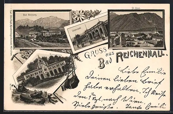 Lithographie Reichenhall, BAd Kirchberg, Colonnade, St. Zeno, Brunnenkapelle