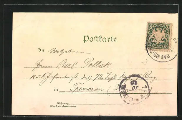 Personenbezogene Daten auf der Rückseite der Karte wurden durch blauen Textmarker unkenntlich gemacht. Die blauen Stellen sind auf die Vorderseite durchgeweicht und wirken sich negativ auf das Postkartenfoto aus