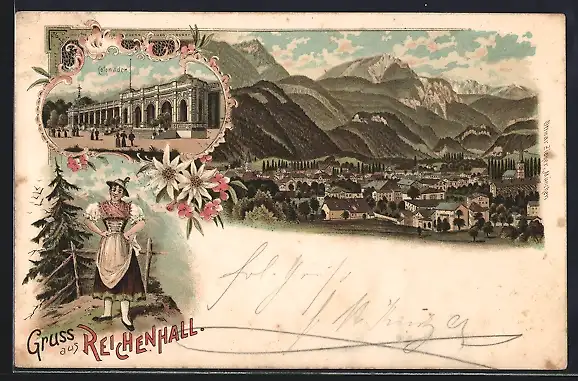 Lithographie Reichenhall, Ortsansicht, Colonaden, Frau in Tracht