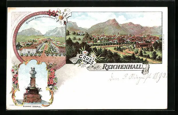 Lithographie Reichenhall, Ortsansicht, Kurhaus Achselmannstein, Bismarck-Denkmal