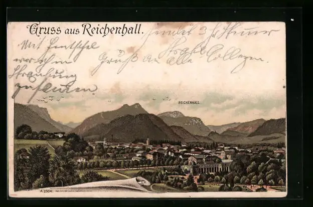 Lithographie Reichenhall, Ortsansicht aus der Vogelschau