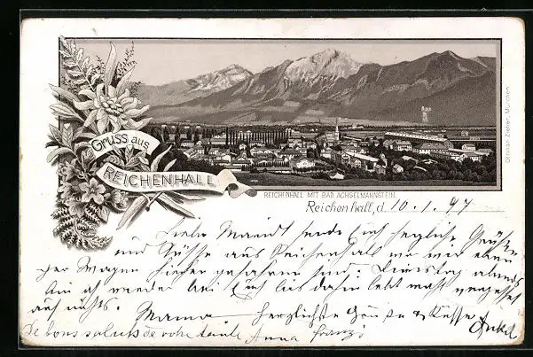 Lithographie Reichenhall, Panorama mit Bad Achselmannstein