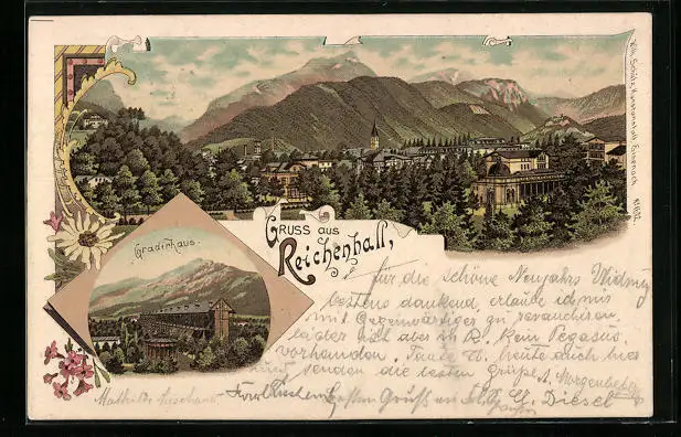 Lithographie Reichenhall, Teilansicht, Gradierhaus