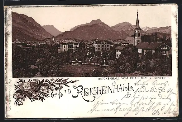 Lithographie Reichenhall, Teilansicht mit Kirche vom Gradierhaus gesehen