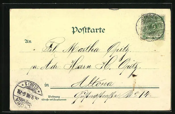 Personenbezogene Daten auf der Rückseite der Karte wurden durch blauen Textmarker unkenntlich gemacht. Die blauen Stellen sind auf die Vorderseite durchgeweicht und wirken sich negativ auf das Postkartenfoto aus