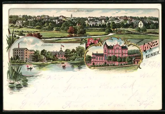 Lithographie Reinbek, Panorama, Schlossteich, St. Adolfs-Stift