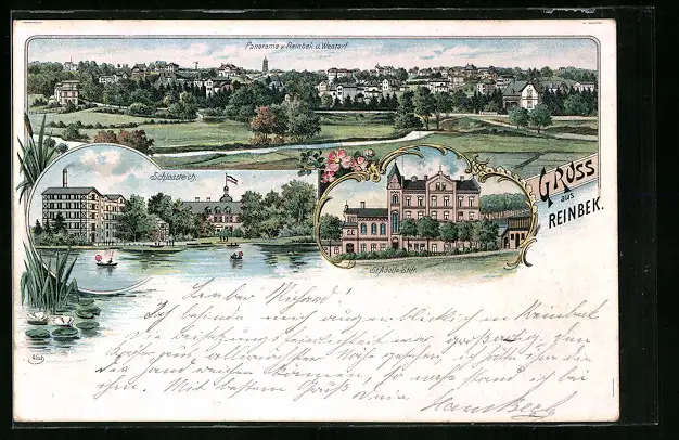 Lithographie Reinbek, Panorama mit Wentorf, Schlossteich, Stt. Adolfs-Stift