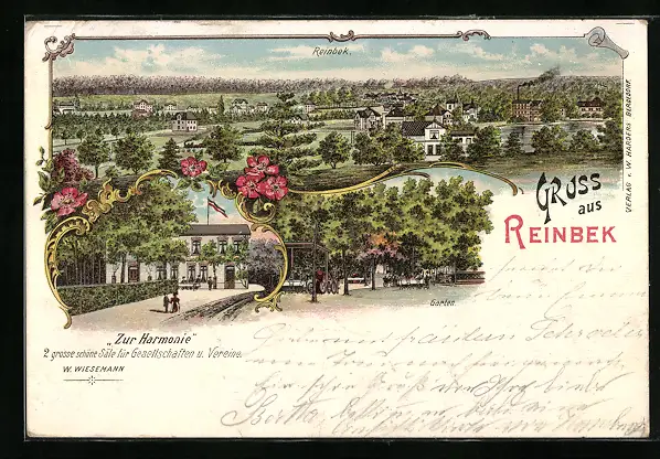 Lithographie Reinbek, Totalansicht mit Gasthaus Zur Harmonie