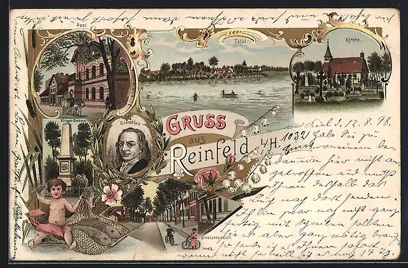 Lithographie Reinfeld i / H., Kirche, Post, Krieger-Denkmal