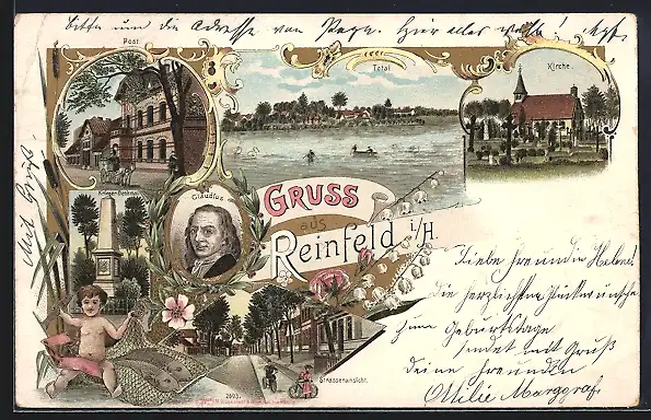 Lithographie Reinfeld i. H., Krieger-Denkmal, Postamt, Kirche, Strassenansicht