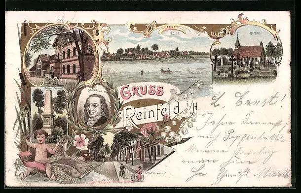 Lithographie Reinfeld i. H., Post, Glaudius im Portrait, Krieger-Denkmal, Kirche und Strassenansicht