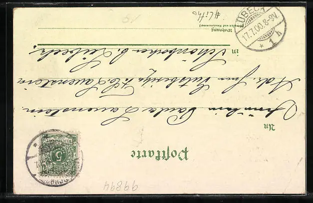 Personenbezogene Daten auf der Rückseite der Karte wurden durch blauen Textmarker unkenntlich gemacht. Die blauen Stellen sind auf die Vorderseite durchgeweicht und wirken sich negativ auf das Postkartenfoto aus