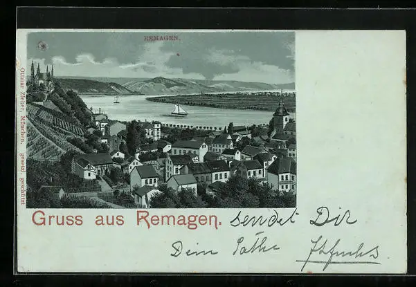 Lithographie Remagen, Ortsansicht aus der Vogelschau