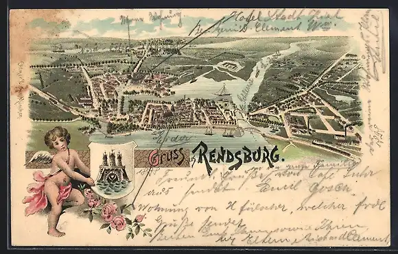 Lithographie Rendsburg, Ortspanorama, Engel mit Rosen