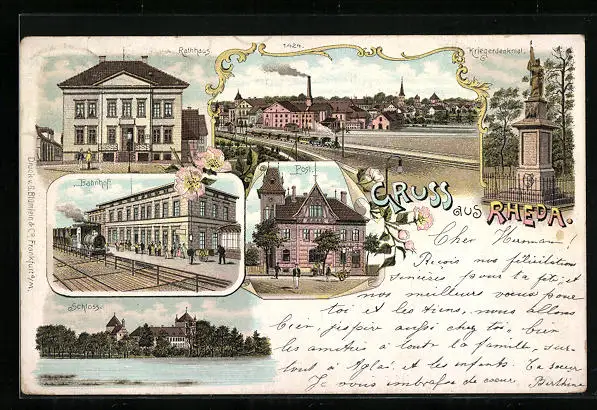 Lithographie Rheda, Bahnhof, Postamt, Rathaus, Schloss, Panorama