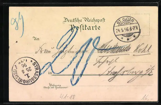 Personenbezogene Daten auf der Rückseite der Karte wurden durch blauen Textmarker unkenntlich gemacht. Die blauen Stellen sind auf die Vorderseite durchgeweicht und wirken sich negativ auf das Postkartenfoto aus