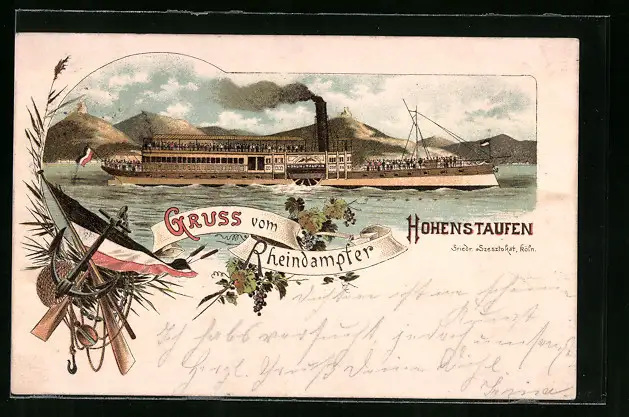 Lithographie Rheindampfer Hohenstaufen in Fahrt