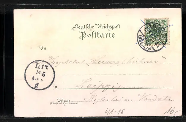 Personenbezogene Daten auf der Rückseite der Karte wurden durch blauen Textmarker unkenntlich gemacht. Die blauen Stellen sind auf die Vorderseite durchgeweicht und wirken sich negativ auf das Postkartenfoto aus