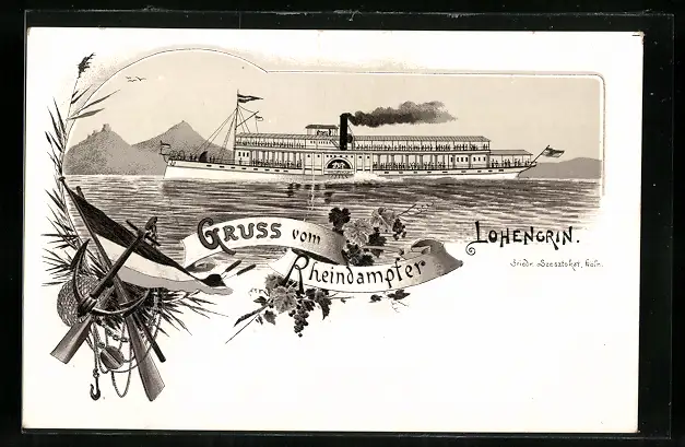 Lithographie Rheindampfer Lohengrin in Fahrt