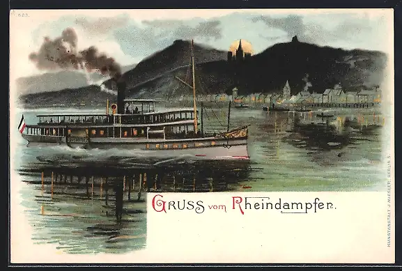 Lithographie Rheindampfer Overstolz bei einer Nachtfahrt