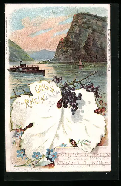 Lithographie Rheindampfer an der Loreley
