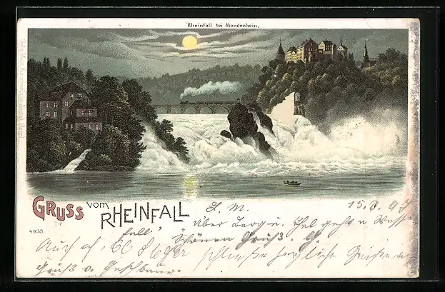Lithographie Rheinfall, Blick zum Wasserfall
