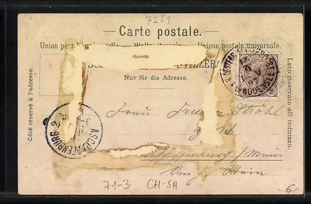 gelaufen 1897, rückseitig Klebe- und Papierreste, rückseitig Oberflächenschaden, guter Zustand