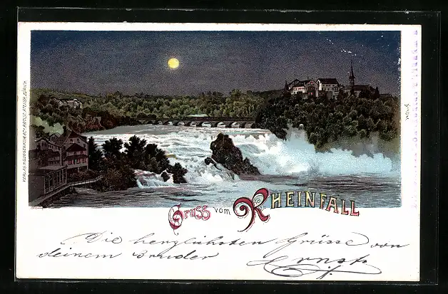 Lithographie Rheinfall, Gesamtansicht mit Schloss Laufen