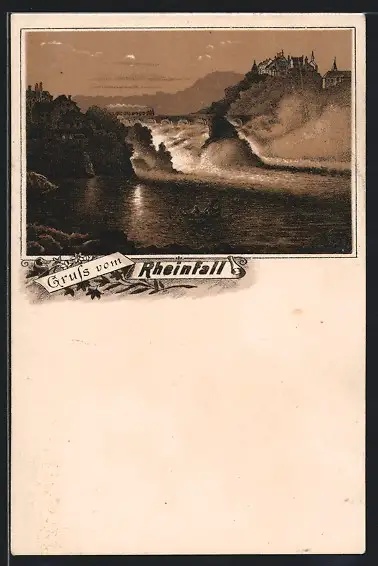 Lithographie Rheinfall, Ortsansicht aus der Vogelschau