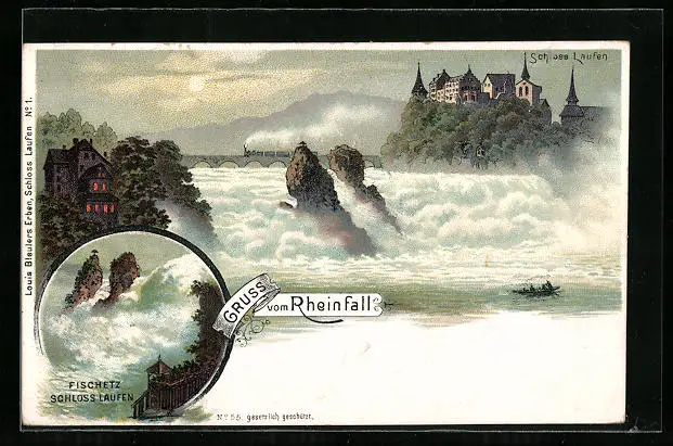 Lithographie Rheinfall, Schloss Laufen, Fischetz