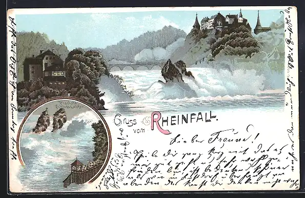 Lithographie Rheinfall, Wasserfall mit Schloss, Fischetz Schloss Laufen