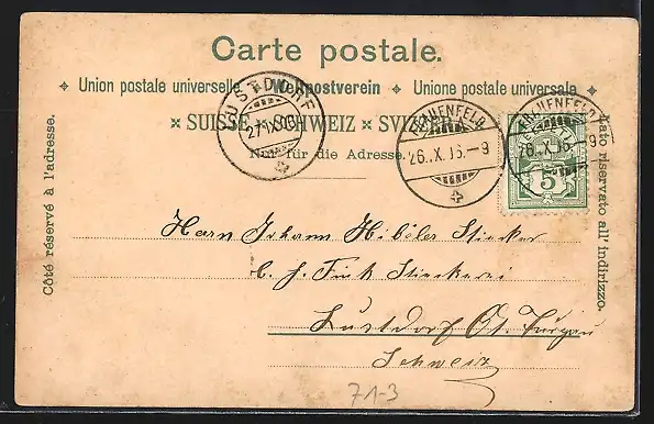 Personenbezogene Daten auf der Rückseite der Karte wurden durch blauen Textmarker unkenntlich gemacht. Die blauen Stellen sind auf die Vorderseite durchgeweicht und wirken sich negativ auf das Postkartenfoto aus
