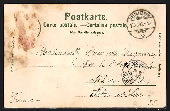 gelaufen 1900, Briefmarke entfernt, rückseitig Oberflächenschaden, guter Zustand
