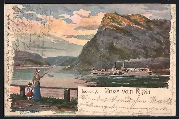 Lithographie Rheinpartie mit Dampfer vor der Loreley