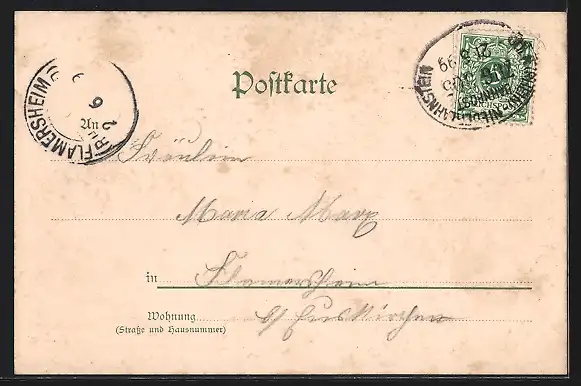 Personenbezogene Daten auf der Rückseite der Karte wurden durch blauen Textmarker unkenntlich gemacht. Die blauen Stellen sind auf die Vorderseite durchgeweicht und wirken sich negativ auf das Postkartenfoto aus