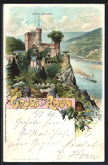 Lithographie Rheinstein, Schloss Rheinstein mit Rheinblick und Dampfer