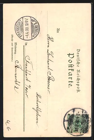 Personenbezogene Daten auf der Rückseite der Karte wurden durch blauen Textmarker unkenntlich gemacht. Die blauen Stellen sind auf die Vorderseite durchgeweicht und wirken sich negativ auf das Postkartenfoto aus