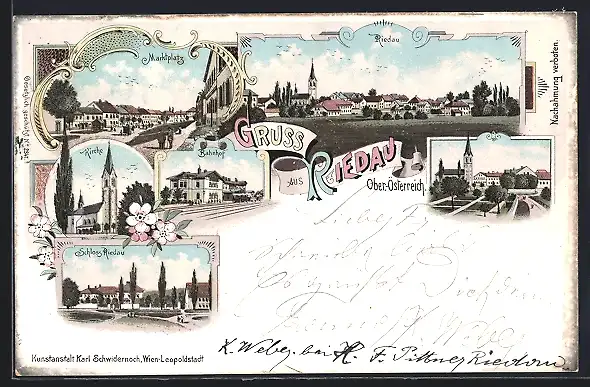 Lithographie Riedau, Gesamtansicht, Marktplatz, Kirche, Bahnhof