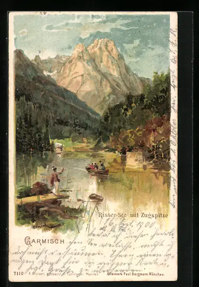 Lithographie Riesersee, Bootspartie mit Blick zur Zugspitze